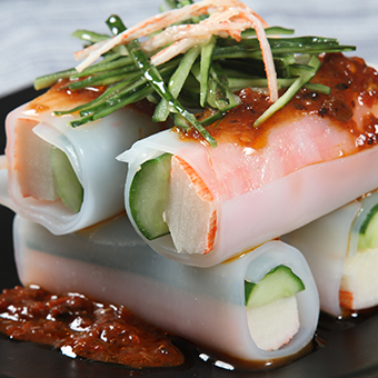 做灋(fa):芝士肠切花(huā),卷上刨好的(de)海猪肉片,煎至微焦,撒上芝麻即可(kě)。